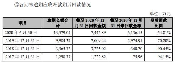 报告期各期末,嘉戎技术逾期应收账款金额分别为1298.77万元、3565.72万元、9984.34万元、13579.04万元,期后回款比例分别为94.15%、90.45%、70.20%、54.81%。