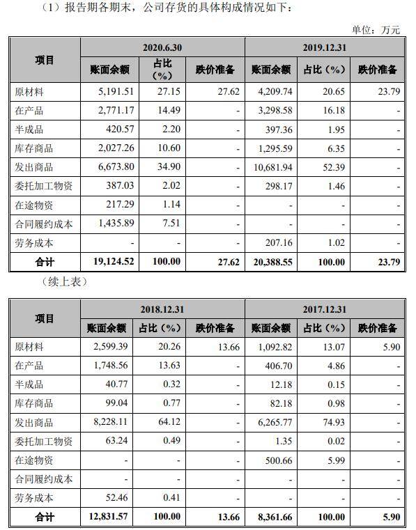 2017年末、2018年末、2019年末、2020年6月末,嘉戎技术存货账面价值分别为8,355.76万元、12,817.91万元、20,364.76万元、19,096.90万元,分别占各期末流动资产的42.61%、43.30%、37.73%、38.11%。各期末,嘉戎技术存货账面余额分别为8,361.66万元、12,831.57万元、20,388.55万元、19,124.52万元。其中,库存商品金额分别为82.18万元、99.04万元、1,295.59万元、2,027.26万元。