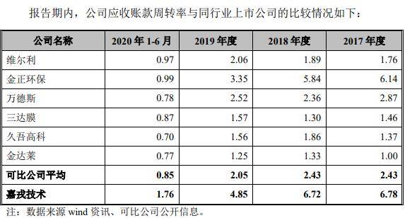 2017年、2018年、2019年、2020年上半年,嘉戎技术应收账款周转率分别为6.78、6.72、4.85、1.76,同行业可比公司应收账款周转率平均值分别为2.43、2.43、2.05、0.85。