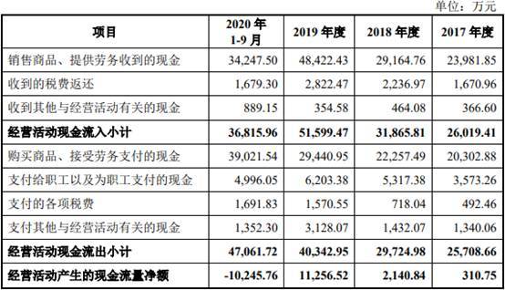 报告期内,海锅股份销售商品、提供劳务收到的现金分别为2.40亿元、2.92亿元、4.84亿元、3.42亿元;经营活动产生的现金流量净额分别为310.75万元、2140.84万元、1.13亿元、-1.02亿元。