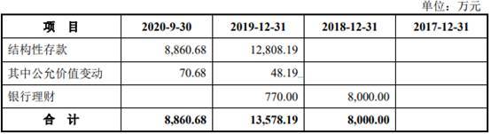 2018年、2019年及2020年9月末,海锅股份银行理财及结构性存款金额分别约8000.00万元、1.36亿元及8860.68万元。截至2020年9月30日,公司交易性金融资产中结构性存款5990万元用于为开具的银行承兑汇票提供质押。