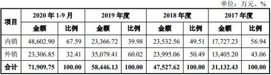 报告期内,海锅股份主要产品内销金额分别为1.77亿元、2.35亿元、2.34亿元、4.86亿元,占主营业务收入的比分别为56.94%、49.51%、39.98%、67.59%;外销金额分别为1.34亿元、2.40亿元、3.51亿元、2.33亿元,占主营业务收入的比分别为43.06%、50.49%、60.02%、32.41%。