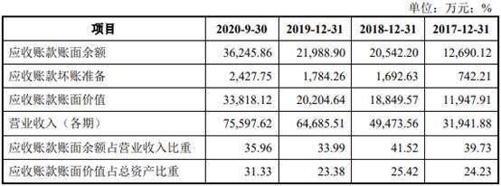 2017年末、2018年末、2019年末和2020年9月末,海锅股份应收账款账面余额分别为1.27亿元、2.05亿元、2.20亿元、3.62亿元,占营业收入比例分别为39.73%、41.52%、33.99%、35.96%。应收账款账面价值分别为1.19亿元、1.88亿元、2.02亿元和3.38亿元,占资产总额比例分别为24.23%、25.42%、23.38%和31.33%。
