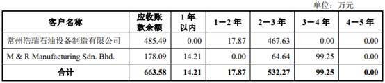 常州浩瑞石油设备制造有限公司系公司客户,其因经营不善资金链断裂,2017年起曾多次被列入失信被执行人。由于常州浩瑞石油设备制造有限公司拖欠货款,公司于2018年10月份起诉该客户,请求对方支付485.49万元货款及银行同期同档利率计算的利息。法院于2018年11月5日判决支持本公司的诉讼请求,但因常州浩瑞石油设备制造有限公司偿债能力弱,未按法院判决期限偿还款项,预计无法收回,因此,公司自2018年起全额计提坏账。此外,公司分别于2019年收到回款1.03万元、2020年1-10月收到回款53.60万元。