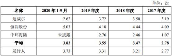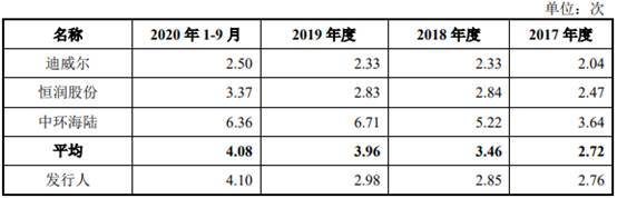 报告期内,海锅股份应收账款周转率分别为2.77次、3.21次、3.31次、3.73次,同行业上市公司平均值分别为2.78次、3.47次、3.55次、3.83次。