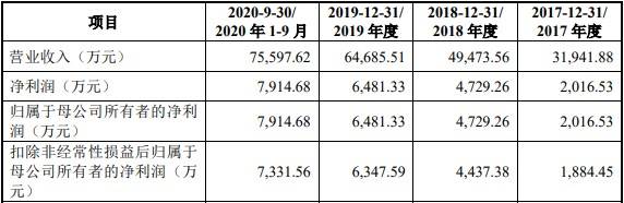 2017年、2018年、2019年、2020年1-9月,海锅股份营业收入分别为3.19亿元、4.95亿元、6.47亿元、7.56亿元,其中主营业务收入分别为3.11亿元、4.75亿元、5.84亿元和7.19亿元;净利润分别为2016.53万元、4729.26万元、6481.33万元、7914.68万元。