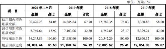 报告期各期末,公司应收账款逾期金额分别为5329.24万元、4759.85万元、7103.06万元及5769.64万元。各期末应收账款余额期后回款率分别为95.07%、96.41%、96.19%、85.53%。