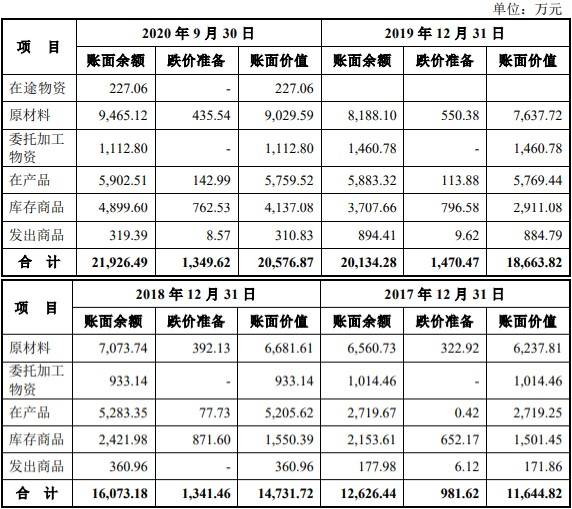截至2017年12月31日、2018年12月31日、2019年12月31日、2020年9月30日,海锅股份的存货账面余额分别为1.26亿元、1.61亿元、2.01亿元、2.19亿元,存货账面价值分别为1.16亿元、1.47亿元、1.87亿元、2.06亿元,存货跌价准备金额分别为981.62万元、1341.46万元、1470.47万元、1349.62万元。