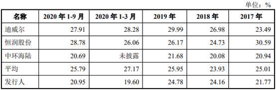 2017年、2018年、2019年、2020年1-3月、2020年1-9月,海锅股份的毛利率分别为21.77%、24.16%、24.78%、19.60%、20.95%,同行业可比公司毛利率平均值分别为25.01%、23.93%、25.95%、27.17%、25.79%。