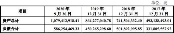 2017年末、2018年末、2019年末、2020年9月末,海锅股份的资产总额分别为4.93亿元、7.42亿元、8.64亿元、10.79亿元;负债总额分别为3.32亿元、5.02亿元、4.50亿元、5.86亿元。