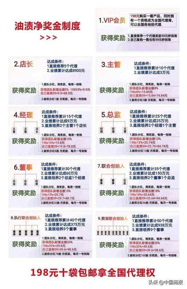 中国商报记者了解到,永春堂公司下设油渍净四宝系列产品,即“厨宝”“去渍净”“衣宝”“重油污净”,该四款产品被宣称,除油渍、污渍、胶渍、锈渍、异味,具有消毒杀菌除螨虫、分解水果蔬菜农药残留等效果,而这“神奇”产品的销售奖金制度备受质疑。