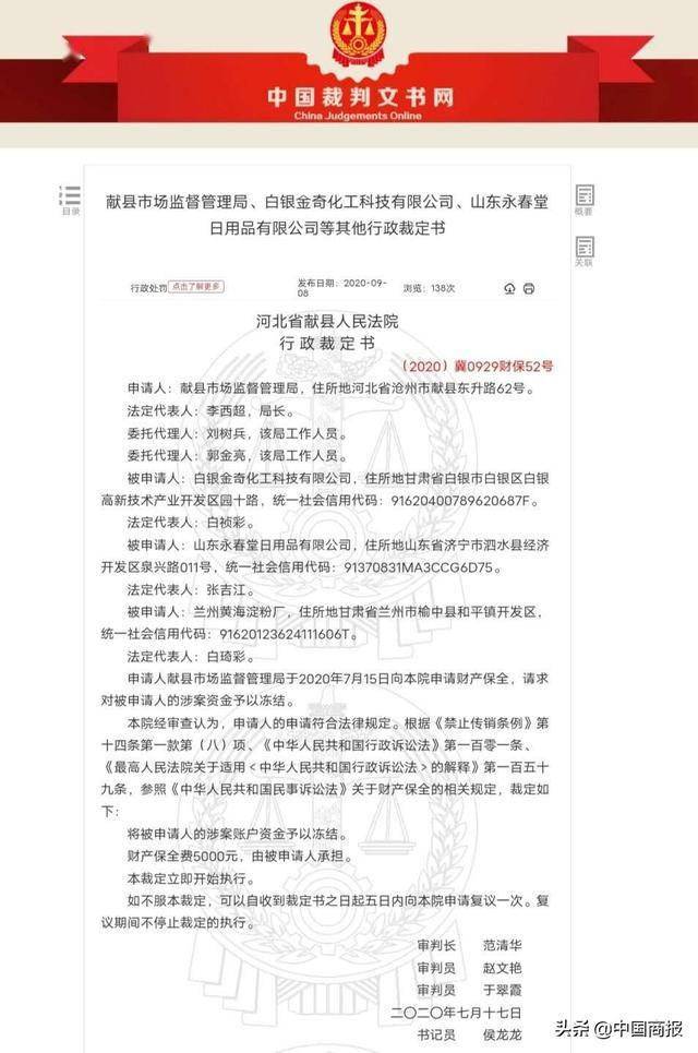 据河北省献县人民法院行政裁定书((2020)冀0929财保52号)显示,申请人献县市场监督管理局于2020年7月15日向法院申请财产保全,请求对被申请人白银金奇化工科技有限公司、山东永春堂日用品有限公司、兰州黄海淀粉厂的涉案资金予以冻结。