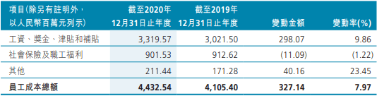 截至2020年末,广州农商银行的员工成本总额为44.33亿元,同比增长7.97%。其中,工资、奖金、津贴和补贴为33.20亿元,同比增长9.86%,社会保险及职工福利为9.02亿元,同比减少1.22%,其他为2.11亿元,同比增长23.45%。
