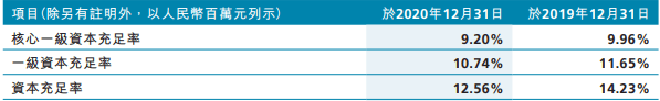 广州农商银行的资本充足率指标均下滑。截至2020年末,广州农商银行的资本充足率为12.56%,较上年同期下降1.67个百分点;一级资本充足率为10.74%,较上年同期下降0.91个百分点;核心一级资本充足率为9.20%,较上年同期下降0.76个百分点。
