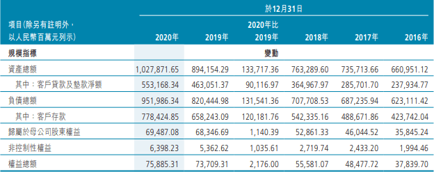 截至2020年末,广州农商银行的资产总额为10278.72亿元,上年同期为8941.54亿元,其中客户贷款及垫款净额为5531.68亿元,上年同期为4630.51亿元;负债总额为9519.86亿元,上年同期为8204.45亿元,其中客户存款为7784.25亿元,上年同期为6582.43亿元。