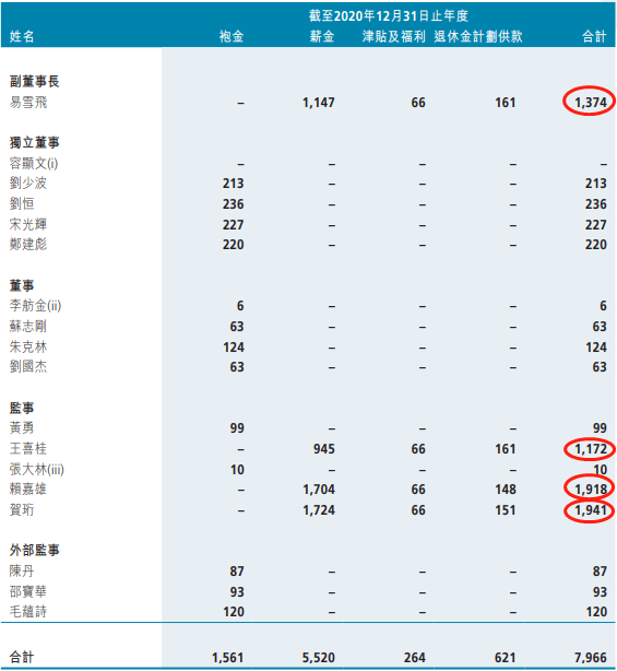 2020年,广州农商银行董事及监事的薪酬合计796.6万元。其中,有4位董事或监事年薪过百万,副董事长易雪飞年薪137.4万元,监事王喜桂年薪117.2万元,监事赖嘉雄年薪191.8万元,监事贺珩年薪194.1万元。