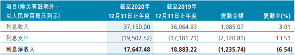 2020年,广州农商银行的利息净收入为176.47亿元,同比减少6.54%。其中,利息收入为371.50亿元,同比增长3.01%;利息支出为195.03亿元,同比增长13.51%。
