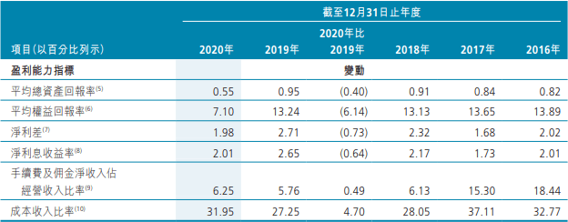 盈利能力方面,2020年,广州农商银行的平均总资产回报率为0.55%,较上年同期下降0.40个百分点;平均权益回报率为7.10%,较上年同期下降6.14个百分点;净利差为1.98%,较上年同期下降0.73个百分点;净利息收益率为2.01%,较上年同期下降0.64个百分点。