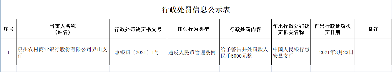 中国经济网北京3月30日讯 中国人民银行福州中心支行网站昨日公布的惠安县支行行政处罚信息公示表(惠银罚〔2021〕1号)显示,泉州农村商业银行股份有限公司(简称“泉州农商银行”)界山支行违反人民币管理条例。2021年3月23日,中国人民银行惠安县支行对该支行给予警告并处罚款人民币5000元整。