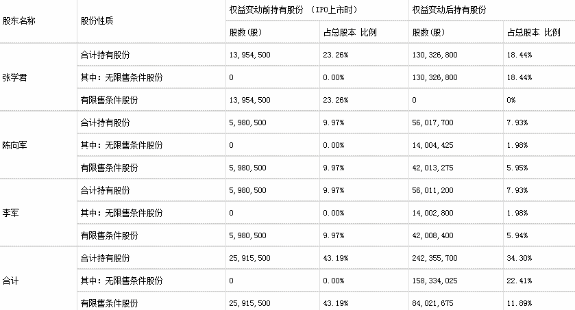 权益变动前(2010年5月26日,IPO上市时),控股股东、实际控制人张学君、陈向军、李军合计持有公司股份2591.55万股,持股比例为43.19%;权益变动后,控股股东、实际控制人张学君、陈向军、李军合计持有公司股份2.42亿股,持股比例为34.30%。