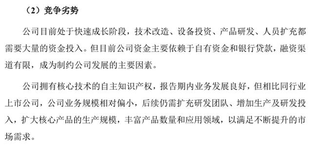 此前明志科技在招股书中的相关描述如上图所示,可以看到,其对竞争劣势披露较为简单,仅包括融资渠道有限以及业务规模偏小,需要进一步补充装备业务国际市场影响力不足这一劣势。