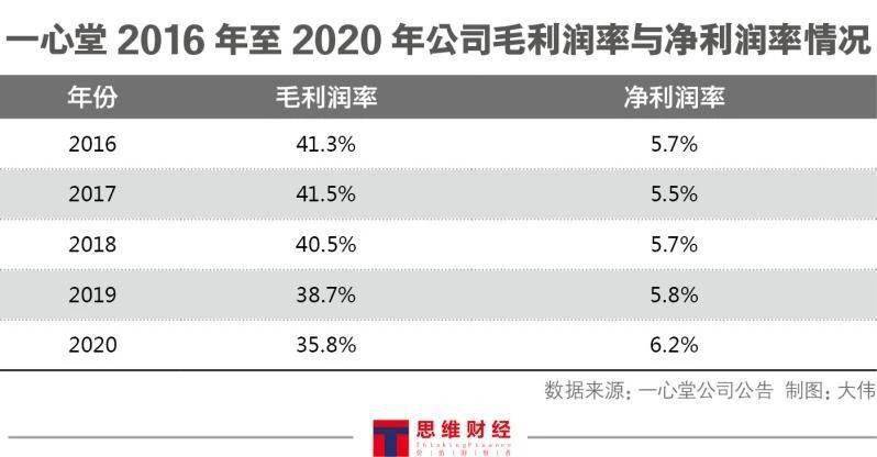 然而,《投资者网》统计之后发现,虽然近五年一心堂的管理费用率与销售费用率都在下降,而且净利润率稳中有升,但公司的毛利润率自2017年后却逐年下降:2020年,公司的毛利润率为35.8%,同比下降2.9%;而且,在“占公司营业收入或营利10%以上的行业、产品或地区情况”一表中,每个分类的毛利润率也出现同比下降。