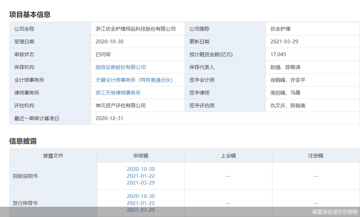 招股书显示,优全护理主要从事非织造材料和护理用品的研发、生产和销售。财务数据显示,2018年-2020年优全护理实现的营业收入分别约11.51亿元、13.16亿元、33.74亿元,对应实现的归属净利润分别约5051.2万元、9479.76万元、11.62亿元。