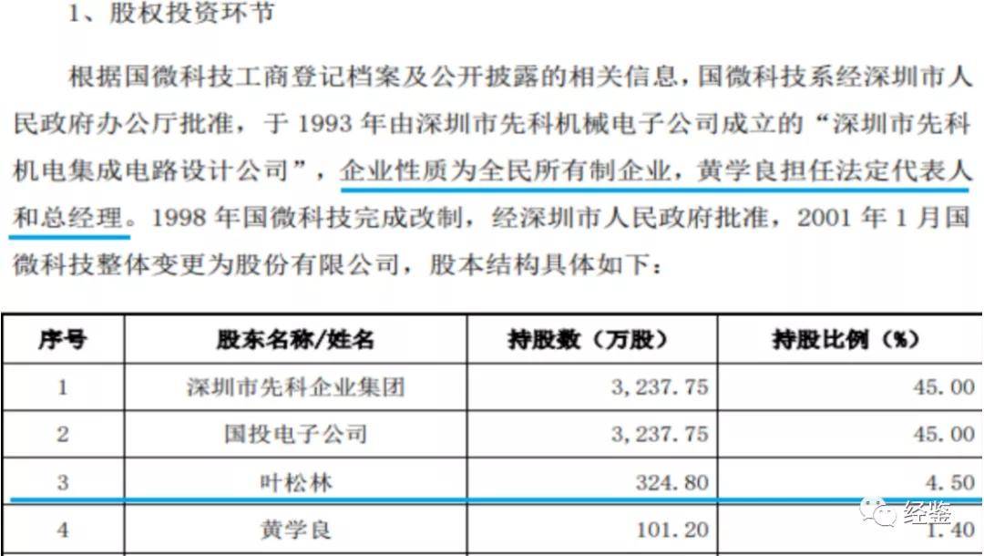 天微有限第一大股东国微科技曾为国有控股股份有限公司,是深圳市投资管理公司二级企业。1998年改制后,深圳市先科企业集团、国投电子公司分别持有国微科技45%的股份,叶松林持有4.5%股份,黄学良持有1.4%股份。黄学良时任国微科技董事、总经理,而叶松林担任何职务并未披露。