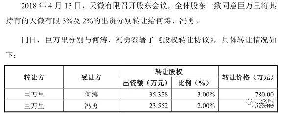 神微电子在一年之后就把所持19%股份转让给韩雷,随后2004年9月,国微科技、四川巨人、韩雷分别将持有天微有限20%、30%、35%的股权转让给巨万里。
