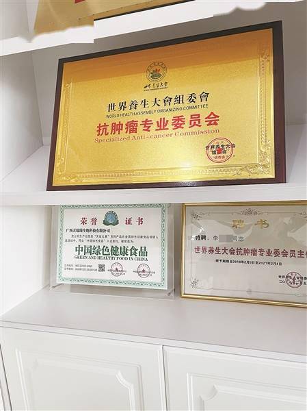 3月26日上午,记者来到天缘绿集团位于南宁北部湾科技园总部基地的办公点。在公司进门口的墙上,董事长李某的照片下写有“世界养生大会抗肿瘤专业委员会主任”“天绿元素品牌创始人”等头衔。会客厅摆有不少牌匾。其中一个聘书牌匾显示,世界养生大会组委会特聘李某为“世界养生大会抗肿瘤专业委员会主任”。