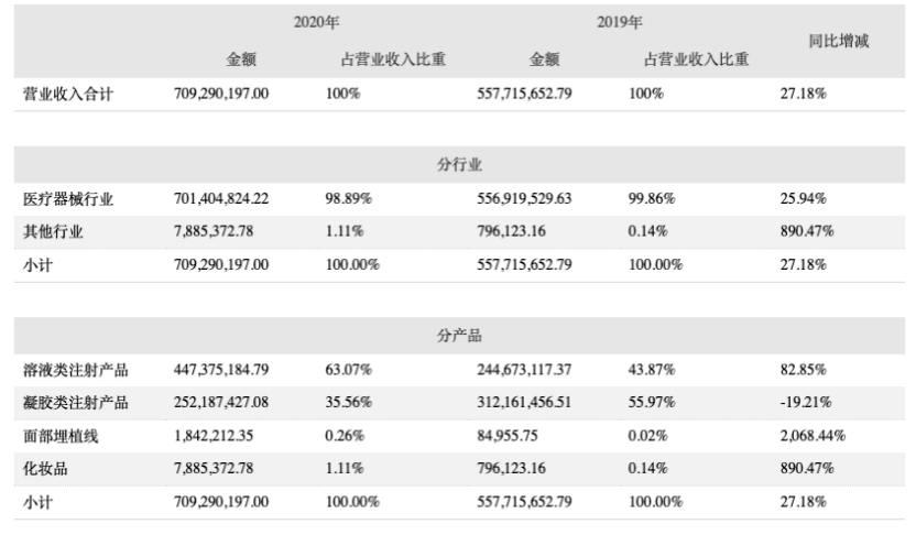 从产品收入分析,爱美客全年业绩主要增长来自于以嗨体为核心产品的溶液类注射针剂。2020年,该类产品实现营业收入4.47亿元,较上年同期增长82.85%。