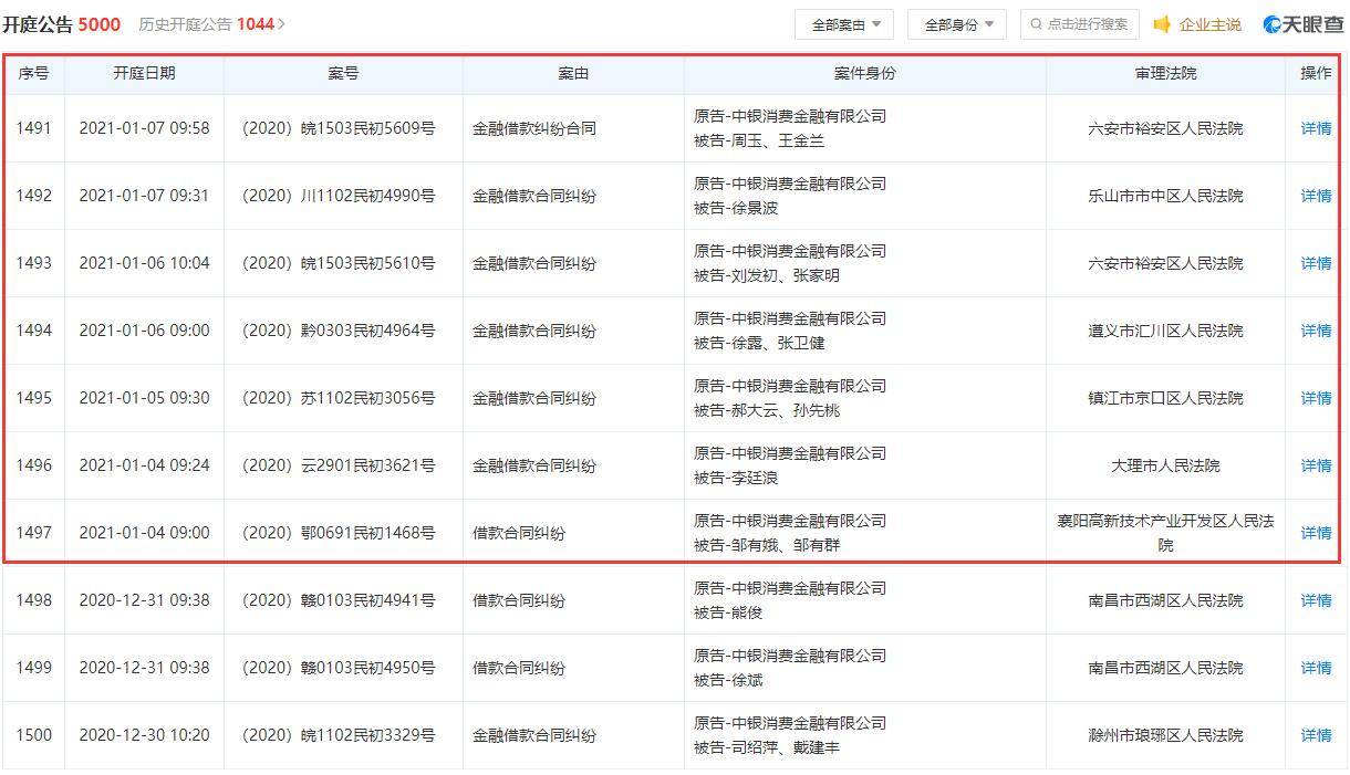 天眼查显示,中银消费金融的开庭日期已排到6月份,案由多数为金融借款合同纠纷。开庭日期从2021年1月4日到6月24日,共有1497起开庭公告。