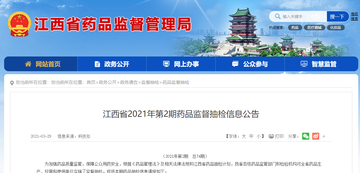 中国经济网北京3月31日讯 (记者 何潇 马先震)江西省药品监督管理局网站近日公布了《江西省2021年第2期药品监督抽检信息公告》(2021年第2期 总74期)。为加强药品质量监管,保障公众用药安全,根据《药品管理法》及相关法律法规和江西省药品抽检计划,江西省各级药品监管部门和检验机构对全省药品生产、经营和使用单位实施了监督抽检。经核查确认,本期监督抽检信息公布如下:8个品种9批次不符合规定,不符合规定项目包括性状、检查、含量测定等。