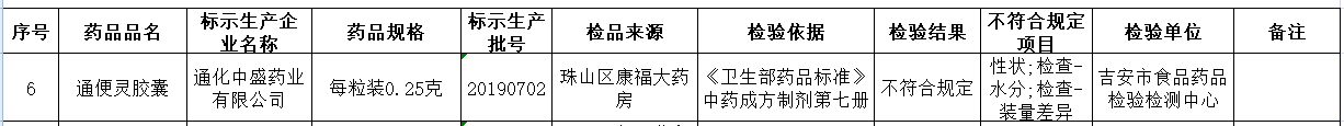 其中不符合规定信息汇总表第6项显示,来源珠山区康福大药房、标称通化中盛药业有限公司生产的通便灵胶囊(药品规格:每粒装0.25克;标示生产批号:20190702)不符合规定项目为:性状;检查-水分;检查-装量差异。检验依据为《卫生部药品标准》中药成方制剂第七册,检验单位为吉安市食品药品检验检测中心。