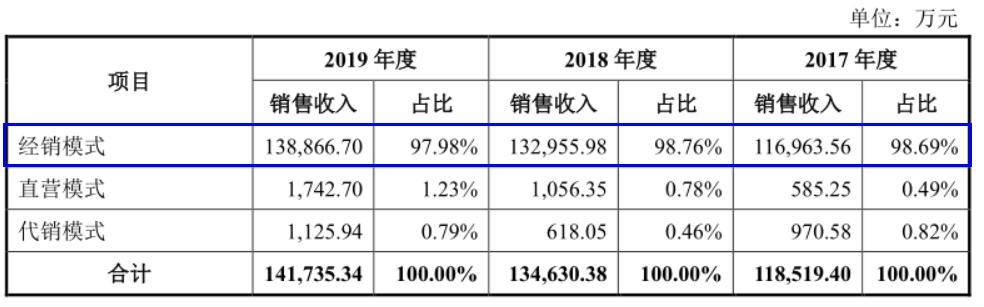 从渠道结构上看,欢乐家目前对经销商模式较为依赖。数据显示,2017年-2019年,欢乐家经销收入分别为 116,963.56 万元、132,955.98 万元和138,866.70 万元,所占比例分别为 98.69%、98.76%和 97.98%,占据绝对主导地位。
