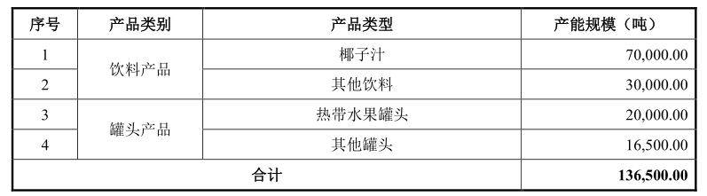 其中,年产 13.65 万吨饮料项目、罐头建设项目投资金额为2.58亿元。本项目建成后,公司将新增饮料产能10万吨、罐头产品产能3.65 万吨。其中,新增椰子汁产品产能规模最高,达到7万吨。