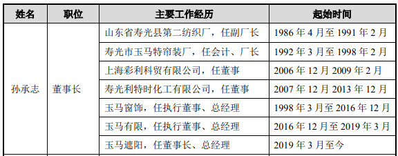往前追溯,玉马遮阳的实控人孙承志先生,原为山东省寿光县第二纺织厂(国营企业)副厂长、寿光市玉马特帘装厂(集体企业)厂长,此后才在1998年创办玉马窗饰,从公司名称来看就与孙承志此前担任厂长的“寿光市玉马特帘装厂”存在关系。