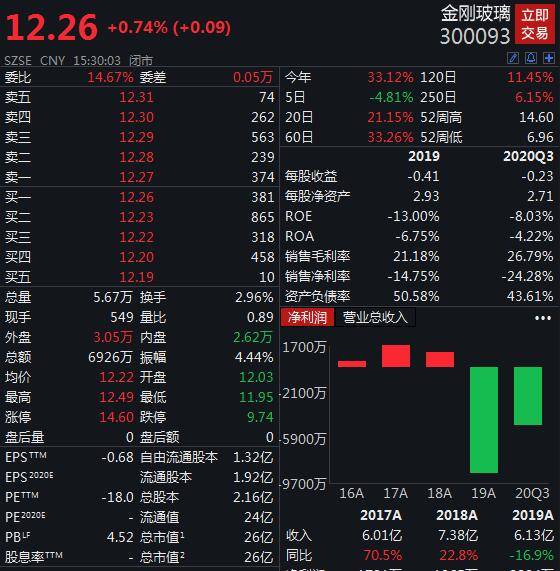 二级市场上,金刚玻璃股价涨0.74%报12.26元/股,总市值26亿元。