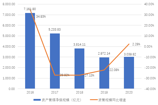 从资管规模来看,业绩最好的2016年也是公司资管规模最高的一年。2016年资产管理净值规模达7161.80亿元,随后在2017-2019年,资管规模下滑速度均超20%,2020年有所缓和,较2019年同比增长2.28%,最新规模为3039.82亿元。