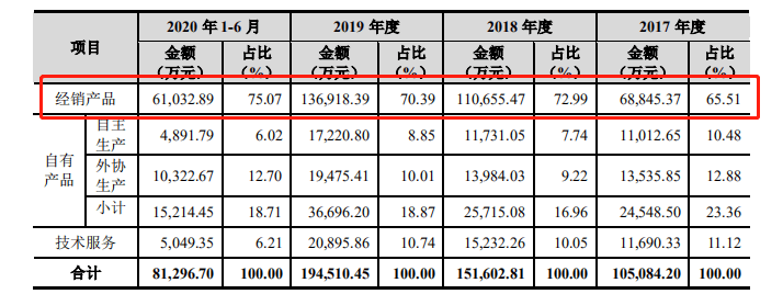 首先,咸亨国际的主营产品分为自有产品和经销产品两大类,其中自有产品主要包括手动工具、机电工具、电工器材、标识标签等工器具类产品和电工仪器、电工仪表等仪器仪表类产品。2017年-2020年上半年,咸亨国际来源于经销产品的收入分别为6.88亿元、11.07亿元、13.69亿元和6.10亿元,占当期总收入的比例分别为65.51%、72.99%、70.39%和75.07%,占比很高且不断增加。而同期咸亨国际来源于自有产品的收入分别仅为2.45亿元、2.57亿元、3.67亿元和1.52亿元,占当期总收入的比例分别为23.36%、16.69%、18.87%和18,71%,自有产品占比远低于经销产品。