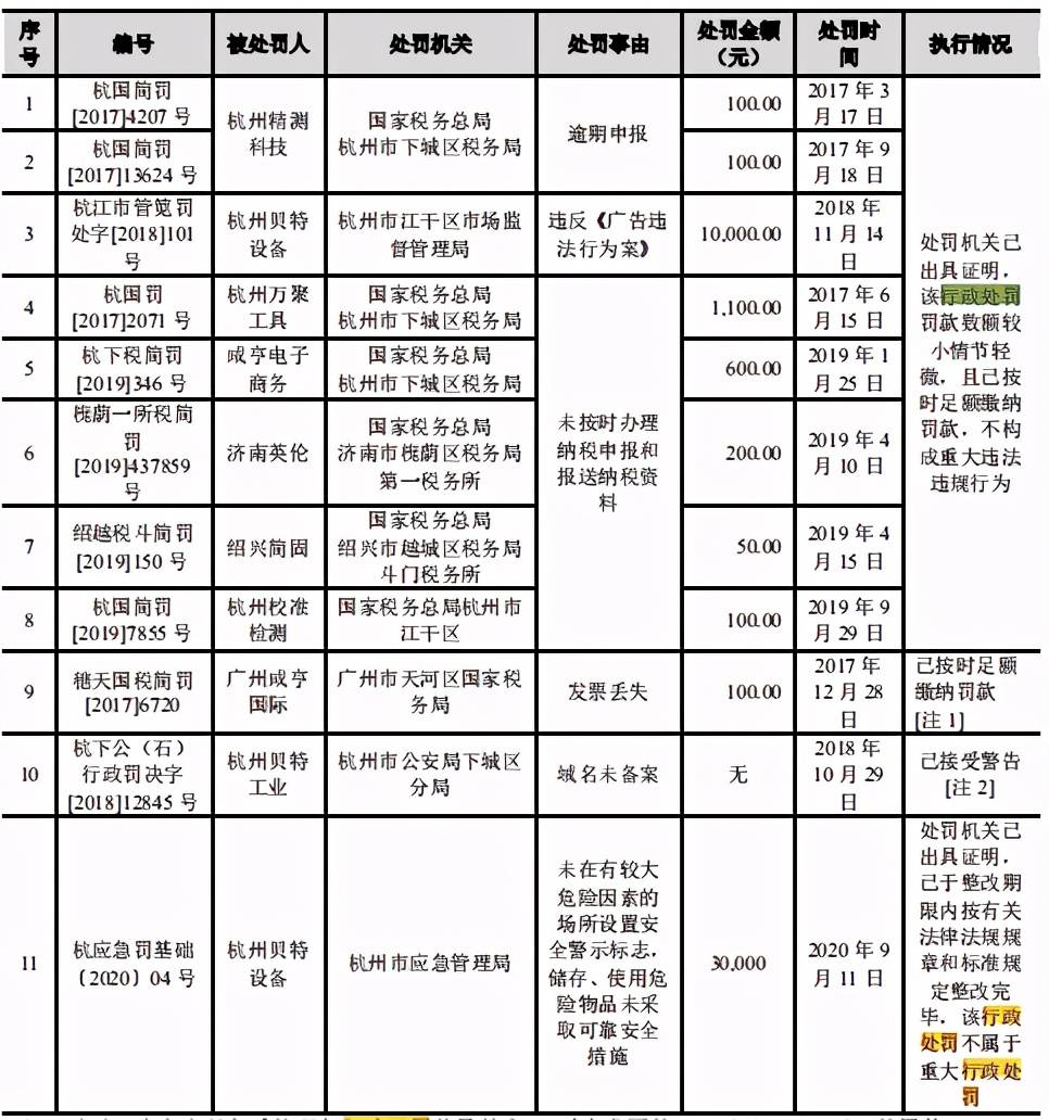 因未按时办理纳税申报和报送纳税资料,2017年6月15日,杭州万聚工具被国家税务总局杭州市下城区税务局罚款1100元;2019年1月25日,咸亨电子被国家税务总局杭州市下城区税务局罚款600元;2019年4月10日,济南英伦被国家税务总局济南市槐荫区税务局第一税务所罚款200元:2019年4月15日,绍兴简固被国家税务总局绍兴市越城区税务局斗门税务所罚款50元;2019年9月20日,杭州校准检测被国家税务总局杭州市江干区罚款100元。