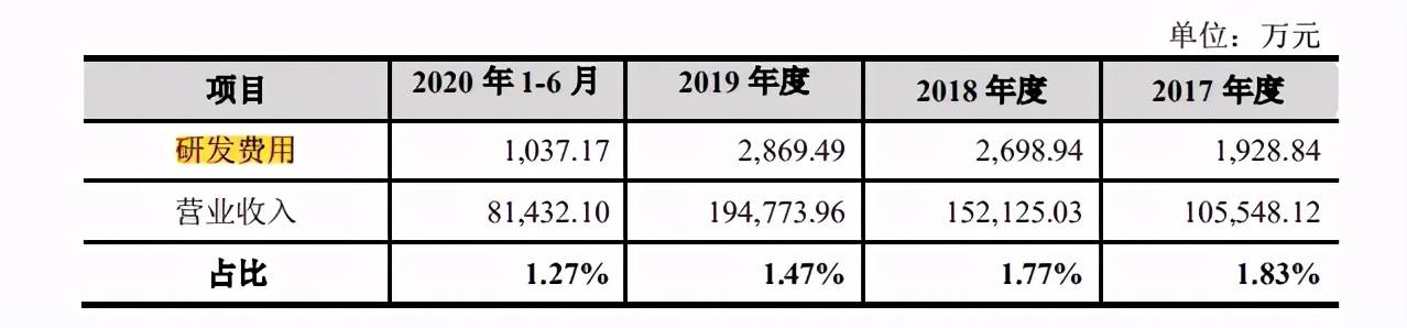 其次,咸亨国际的研发费用很低。2017年-2020年上半年,咸亨国际的研发费用分别为1928.84万元、2698.94万元、2869.49万元和1037.17万元,占当期营业收入的比例仅分别为1.83%、1.77%、1.47%和1.27%,咸亨国际的研发费用率相对较低。