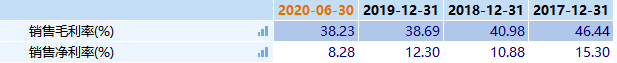 同期,咸亨国际的销售毛利率分别为46.44%、40.98%、38.69%和38.23%,销售净利率分别为15.30%、10.88%、12.30%和8.28%,均呈下跌趋势。