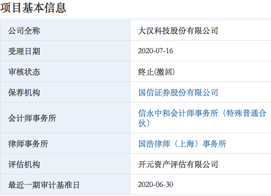 2020 年 7 月 16 日,深交所受理了国信证券保荐的大汉科技创业板IPO申请。2021年1月22日因主动撤回申报,而被终止审核。