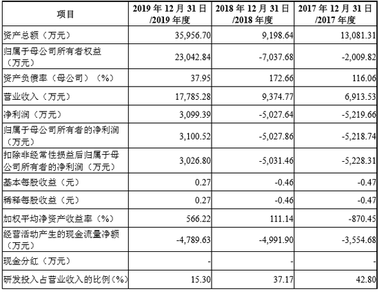 2017年、2018年、2019年及2020年上半年,公司营业收入分别为4.79亿元、9.97亿元、20.95亿元及13.63亿元,扣非归母净利润分别为-0.40亿元、0.62亿元、1.92亿元及1.50亿元。
