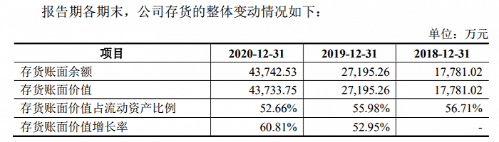 报告期各期末,博盈特焊存货账面余额分别为 17,781.02万元、27,195.26万元、 43,742.53万元,存货账面价值分别为17,781.02万元、27,195.26万元和43,733.75万元,显著增长趋势,且占流动资产的比重分别为 56.71%、55.98%和52.66%,占比较高,是流动资产的主要构成部分。
