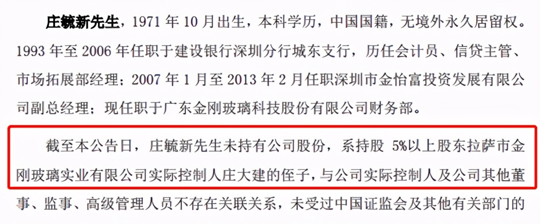 此次公司被抓的庄毓新,于2018年5月成为公司董事(此前在金刚玻璃财务部任职)。彼时,公司发布的公告显示,庄毓新是公司持股5%以上股东拉萨市金刚玻璃实业有限公司(下称“拉萨金刚”)实际控制人庄大建的侄子。而庄大建也是金刚玻璃的前任董事长(2016年2月底离职)。