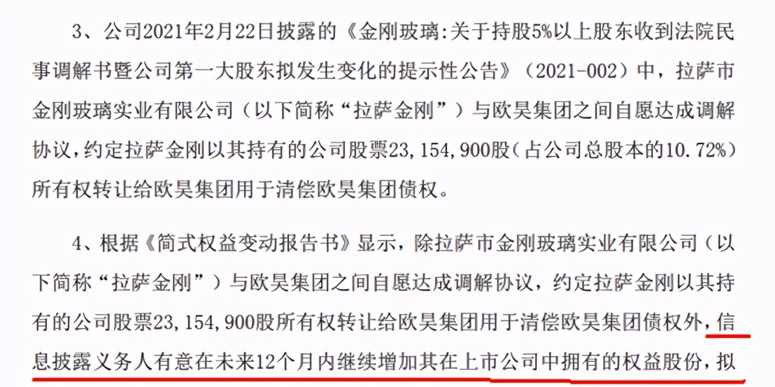 今年2月22日,金刚玻璃公告称,经法院调解,由庄大建实际控制的拉萨金刚与广东欧昊集团有限公司(简称“欧昊集团”)之间自愿达成调解协议,约定拉萨金刚以其持有的公司股票2315.49万股所有权转让给欧昊集团用于清偿欧昊集团债权。