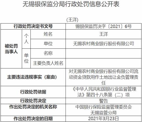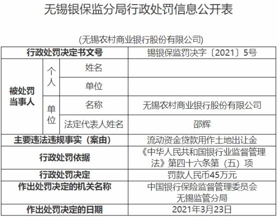 中国经济网北京4月1日讯 银保监会网站今日发布无锡银保监分局行政处罚信息公开表(锡银保监罚决字〔2021〕5号、6号),无锡农村商业银行股份有限公司(证券简称“无锡银行”,证券代码“600908”)存在流动资金贷款用作土地出让金的违法违规事实,银保监会无锡监管分局于2021年3月23日决定对无锡银行罚款人民币45万元,行政处罚依据为《中华人民共和国银行业监督管理法》第四十六条第(五)项。