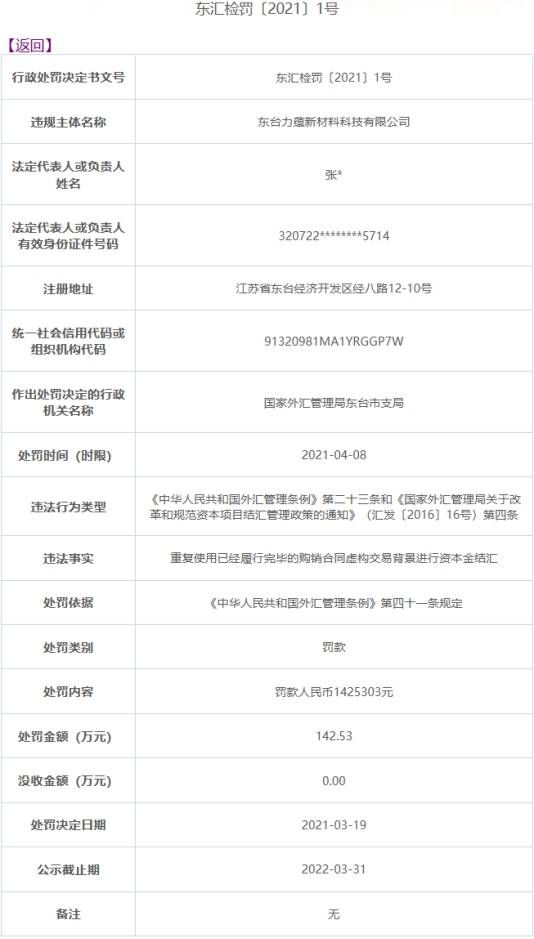 东台力蕴新材料公司违法遭罚143万 资本金结汇存造假